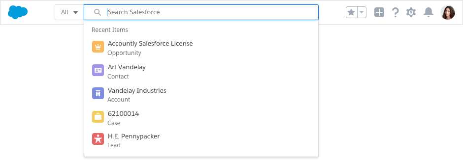 Each item shows the object icon, the record name, such as "Vandelay Industries", and the object name, such as "Account".