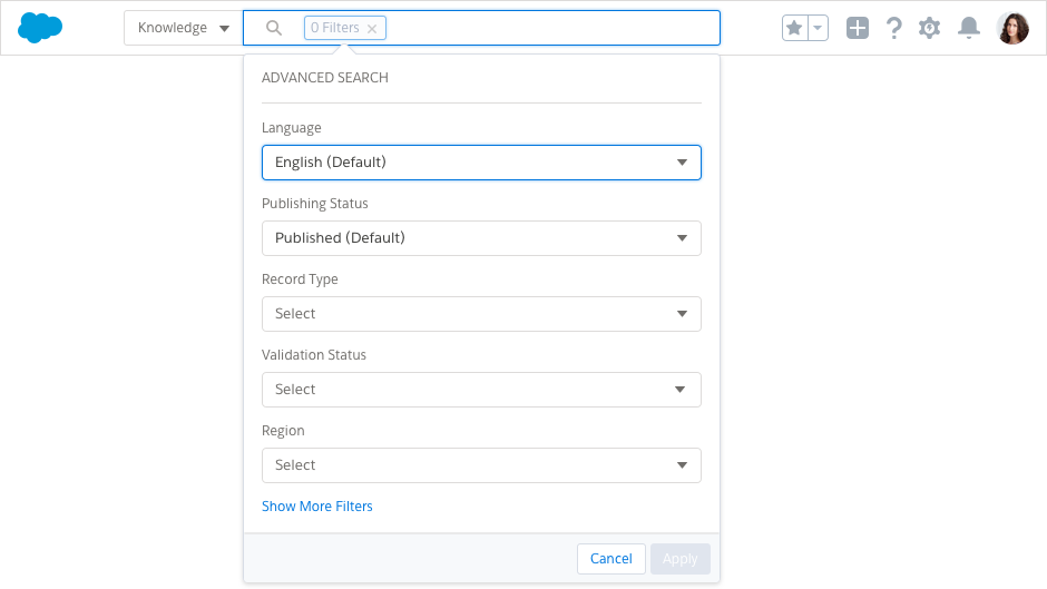 Clicking the "Advanced Search" link in a Knowledge example produces a popover with options like Language, Publishing Status, Record Type, Validation Status, and Region, as well as an option to Show More Filters. Clicking save in this popover adds another pill to the input with the number of filters applied, like "2 Filters".